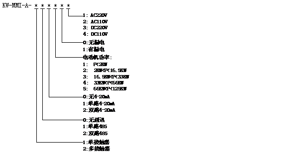 舉例如下:?jiǎn)温方佑|器,2路通訊接口,1路4-20mA輸出接口,電機(jī)額定功率37KW,無(wú)漏電檢測(cè),裝置電源為AC220V,則型號(hào)表示為:KW-MMI-A-121401。