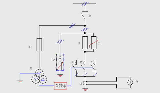 正常運(yùn)行時(shí)微機(jī)控制器不斷檢測(cè)PT提供的電壓信號(hào),一旦系統(tǒng)發(fā)生單相弧光接地時(shí),真空接觸器快速動(dòng)作,將不穩(wěn)定的弧光接地轉(zhuǎn)化為穩(wěn)定的金屬性接地。裝置輸出開關(guān)量接點(diǎn)信號(hào),同時(shí)可通過(guò)RS485(或RS232)接口與微機(jī)監(jiān)控系統(tǒng)實(shí)現(xiàn)數(shù)據(jù)遠(yuǎn)傳。